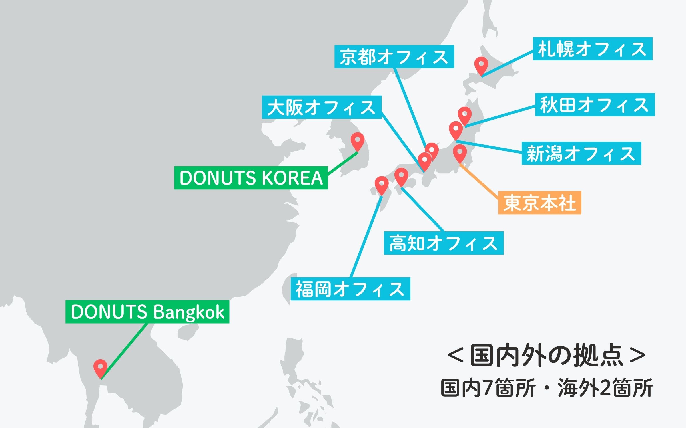 DONUTSでは東京本社に加えて国内7箇所、海外2箇所に拠点を構えています。
