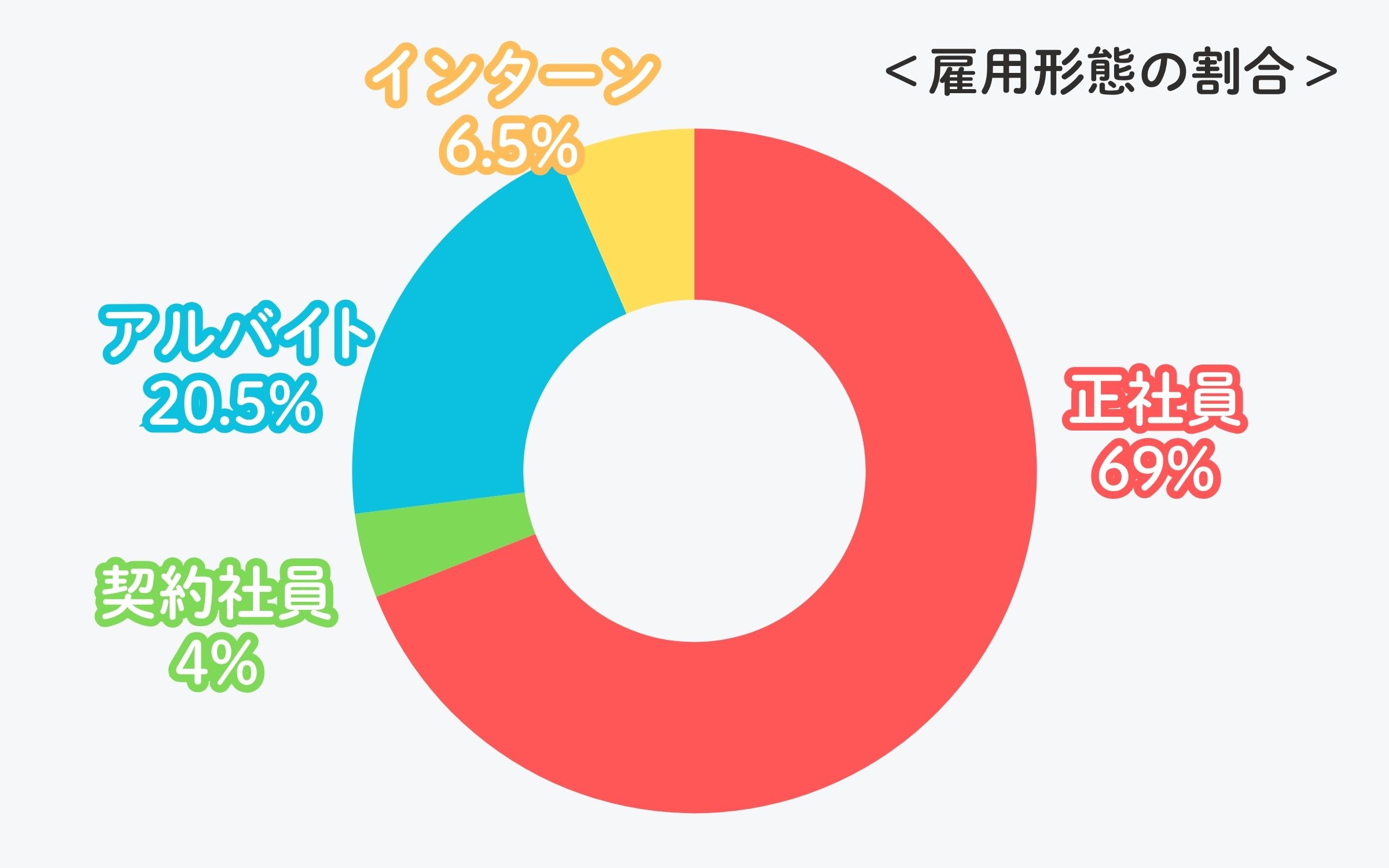 また、雇用形態別に見ると正社員が69%で、正社員の割合は年々増加傾向にあります。