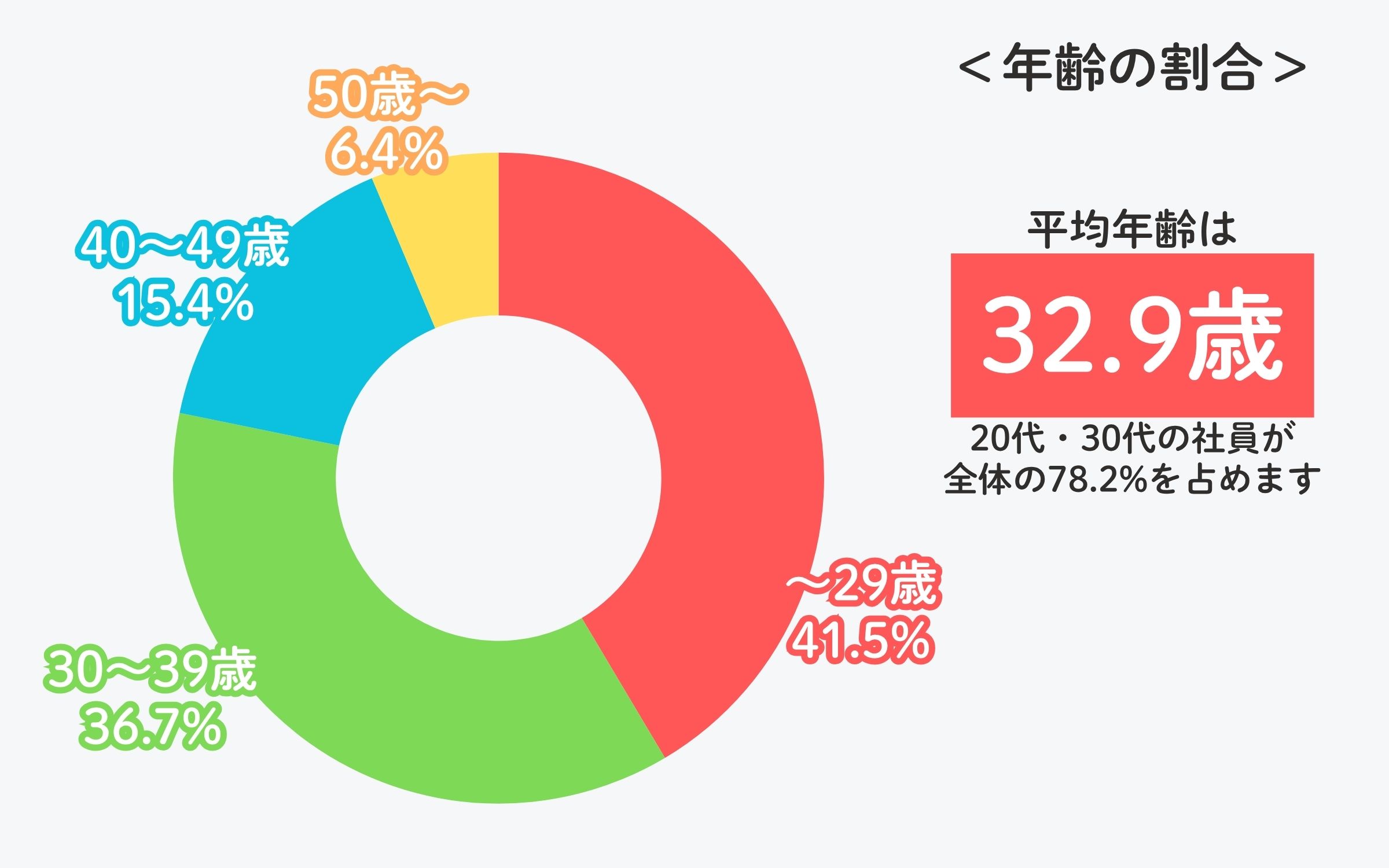 平均年齢は32.9歳でした。20代・30代の社員が全体の約8割を占めており、入社直後から裁量を持って自走し、実践的な経験を積み重ねてきた若手の人材が、DONUTSの安定した成長を根底から支えていることがわかります。