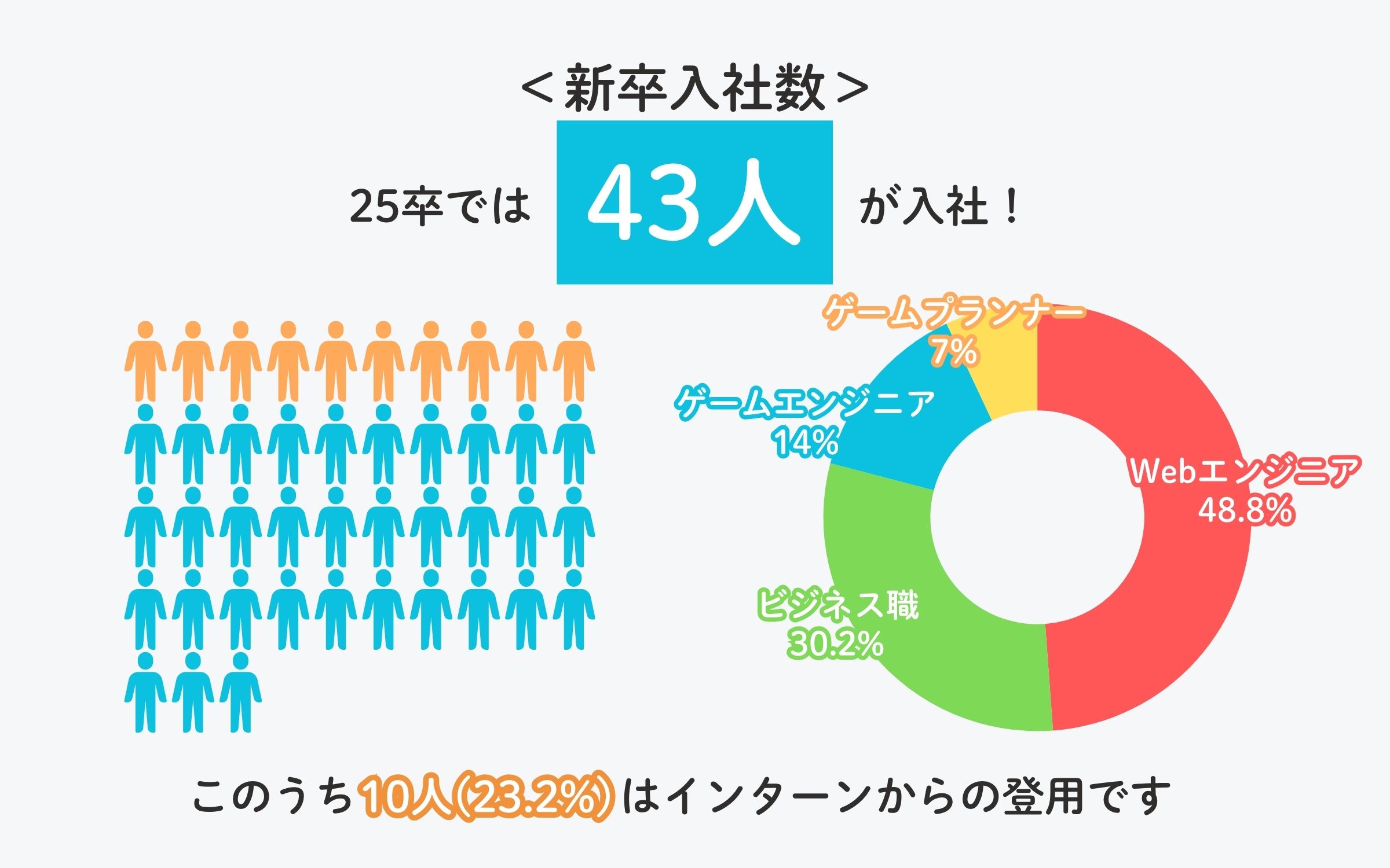 新卒社員の職種のうち、最も多いのはWebエンジニアで、ゲームエンジニアと合わせると6割以上がエンジニアとなっています。「PRODUCT FIRST」を実現するために優れたプロダクトを生み出すことを常に目指している中で、既に現場の重要な戦力として活躍している新卒社員はとても心強い存在です。