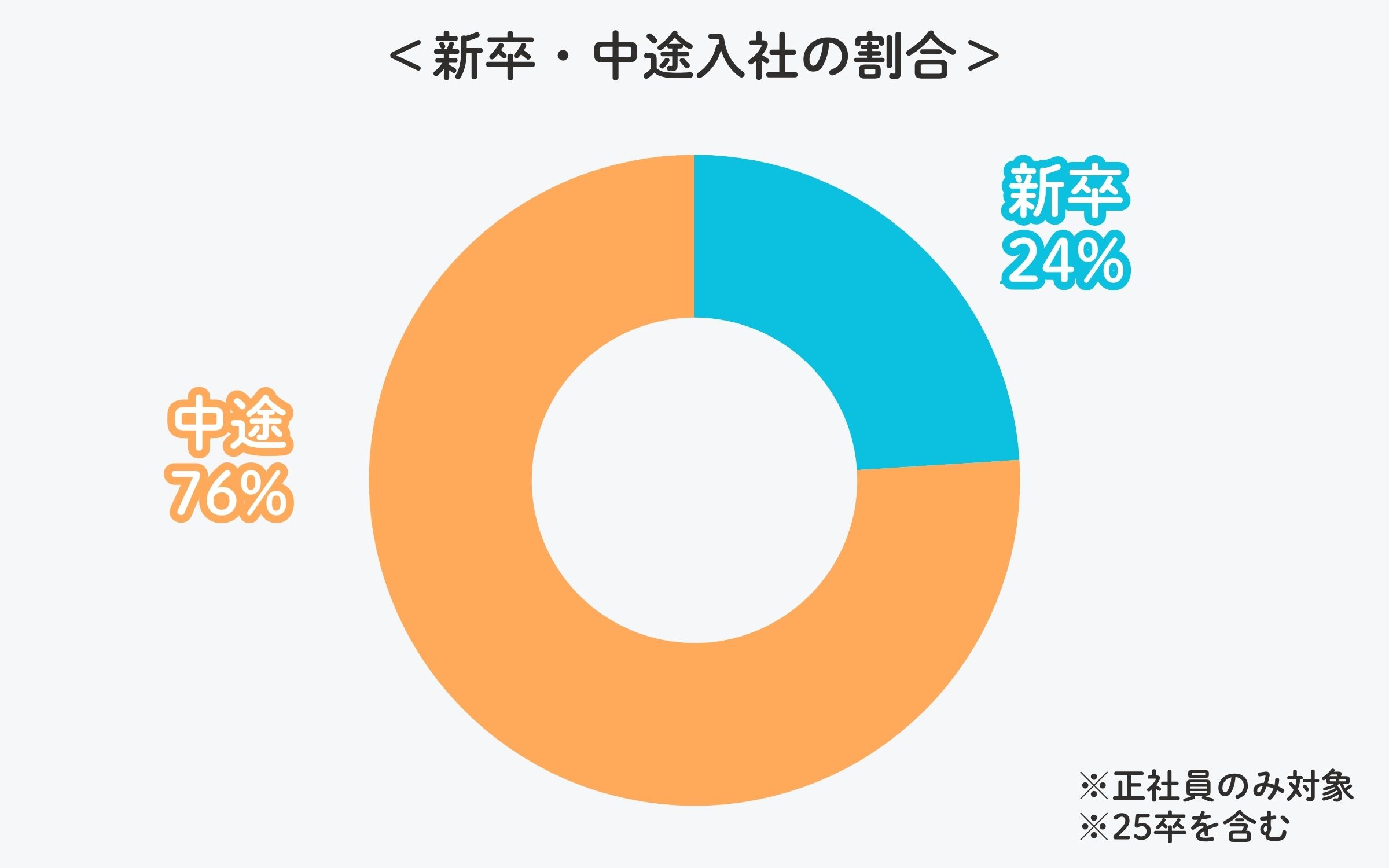 また、新卒と中途入社では新卒の割合が増加しており、社員の約4分の1が新卒社員となっています。