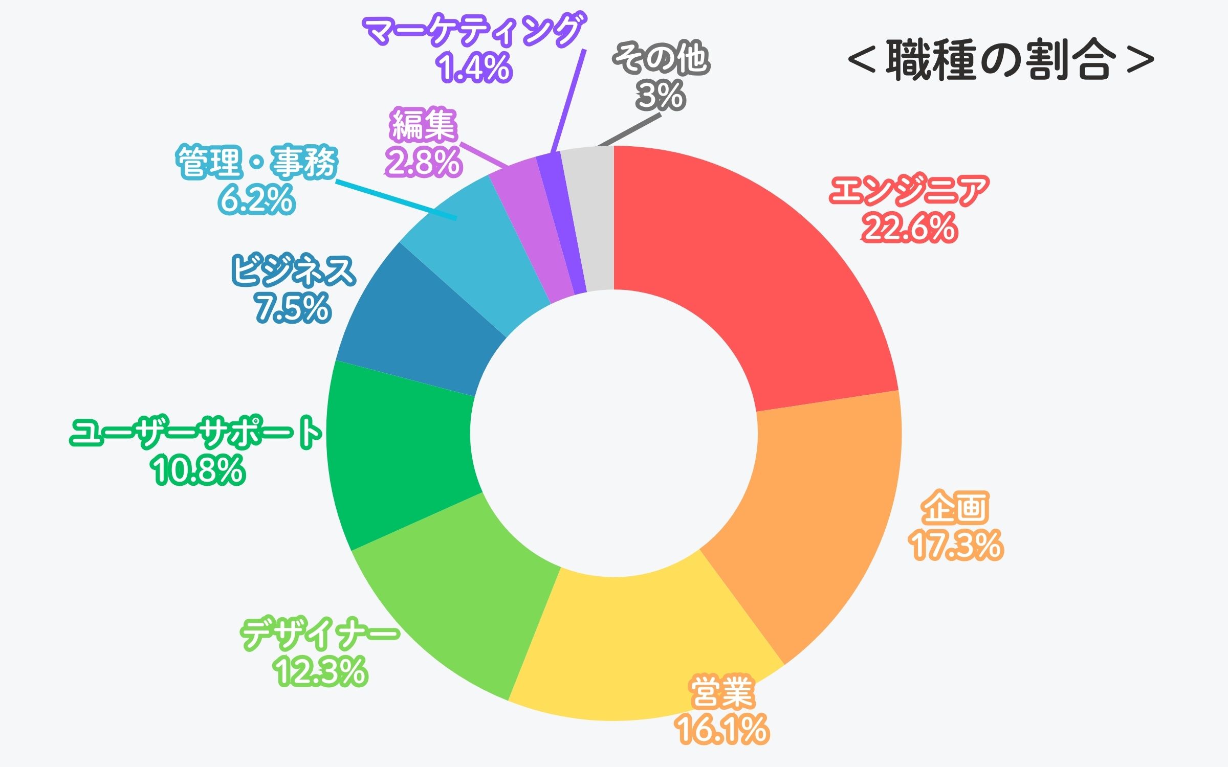 職種別に見ると、プロダクトを生み出すエンジニアや企画職が多く、全体の約4割を占めています。DONUTSでは最高のプロダクトを作る「PRODUCT FIRST」のビジョンのもと、常にプロダクトの成功を考え、社員一人一人が緊張感と責任感を持って行動しています。